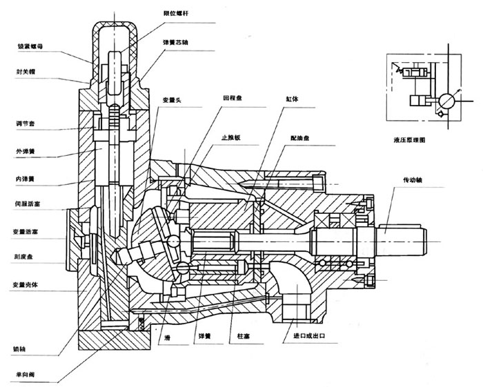反之,当泵的压力克服弹簧力使伺服活塞向上动时,堵塞通道(h),使(g)腔油通过(i)而卸压,此时变量活塞上移,泵的流量减小。